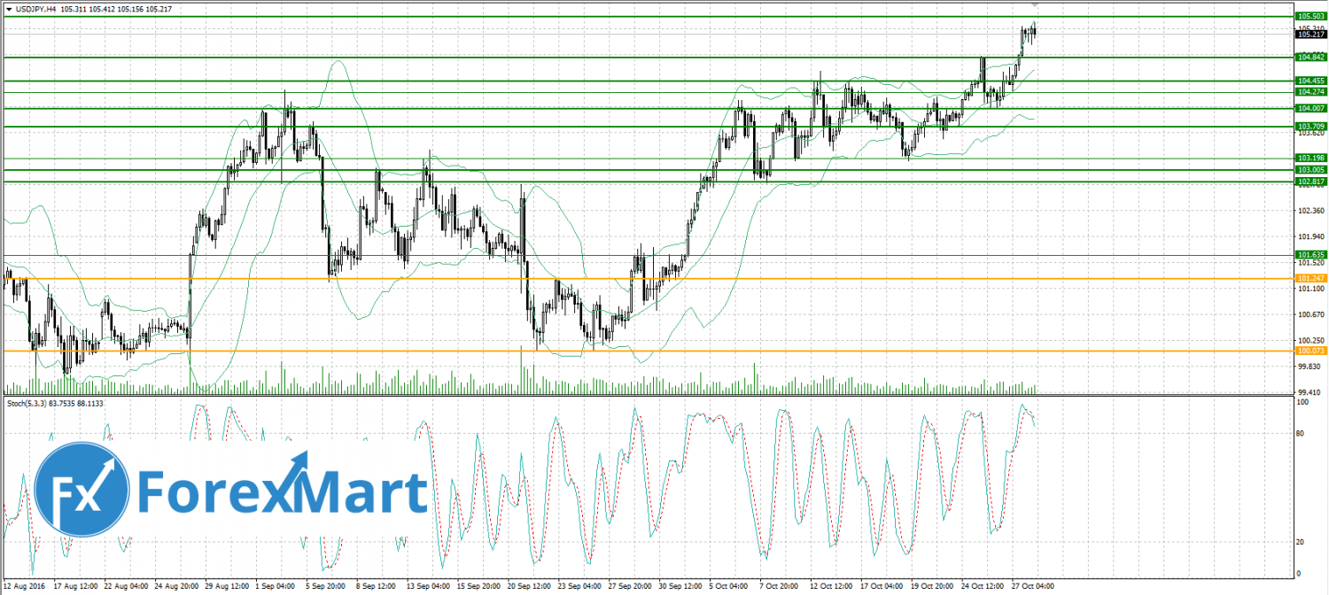 В валютной паре доллар/йена на этой неделе сильно преобладают бычьи настроения. Пара уверенно показывает рост и уже вошла в зону 105.1-105.50. Сейчас либо произойдёт коррекция от этих уровней вниз, либо продолжится восходящее движение. Подавляющее большинство трейдеров сейчас в ожидании разворота: 37% стоят в покупках, 63% продают. Моментум демонстрирует среднюювнутредневную скорость, тольги производятся небольшими объемами. Линия. Стохастик на четырехчасовом графике находится в зоне перекупленности, Боллинджер сигнализирует о расширение канала волатильности. Сегодня можно рассматривать среднесрочные продажи, но только в сочетании с данными по ВВП Америки.