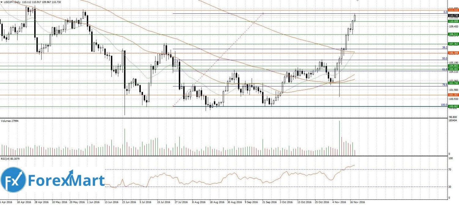 Валютная пара японская иена/доллар США продолжает движение в сильном восходящем тренде на фоне выступления главы ФРС. Джанет Йеллен не сделала никаких значительных заявлений и никак не комментировала избрание нового президента США, однако это придало сил доллару и он набрал пунктов против многих основных валют. Технически пара находится в зоне перекупленности и нуждается в коррекции, но это не мешает ей уверенно двигаться по направлению к линии сопротивления 111.30 до которой осталось менее 100 пунктов. В ближайшем времени ожидаем тест уровня и долгожданный уход на коррекцию.
