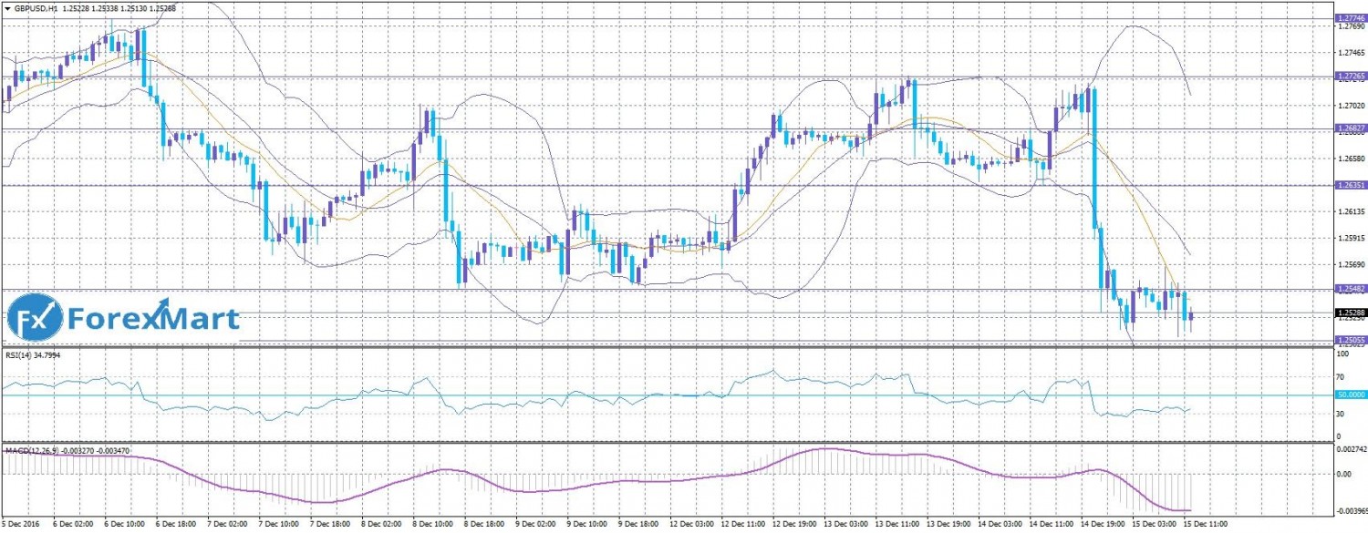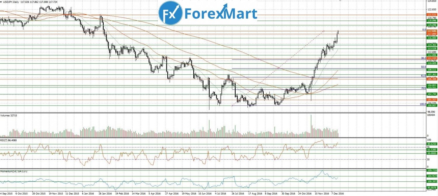 Валютная пара доллар/иена сильно выросла после заявлений представителей ФРС о намерении дважды в следующем году повысить процентные ставки. Джанет Йеллен во время своего выступления тоже заняла более ястребиную позицию, чем от неё ожидали. Поэтому доллар сильно вырос против основных валют. Пара вчера достигла уровня сопротивления 117.00, сегодня торгуется в районе 117.60. Ближайшая цель на повышение находится у отметки 119.00. В случае глубокой коррекции, в которой пара уже давно нуждается, актуальная линия сопротивления находится возле области 113.50.