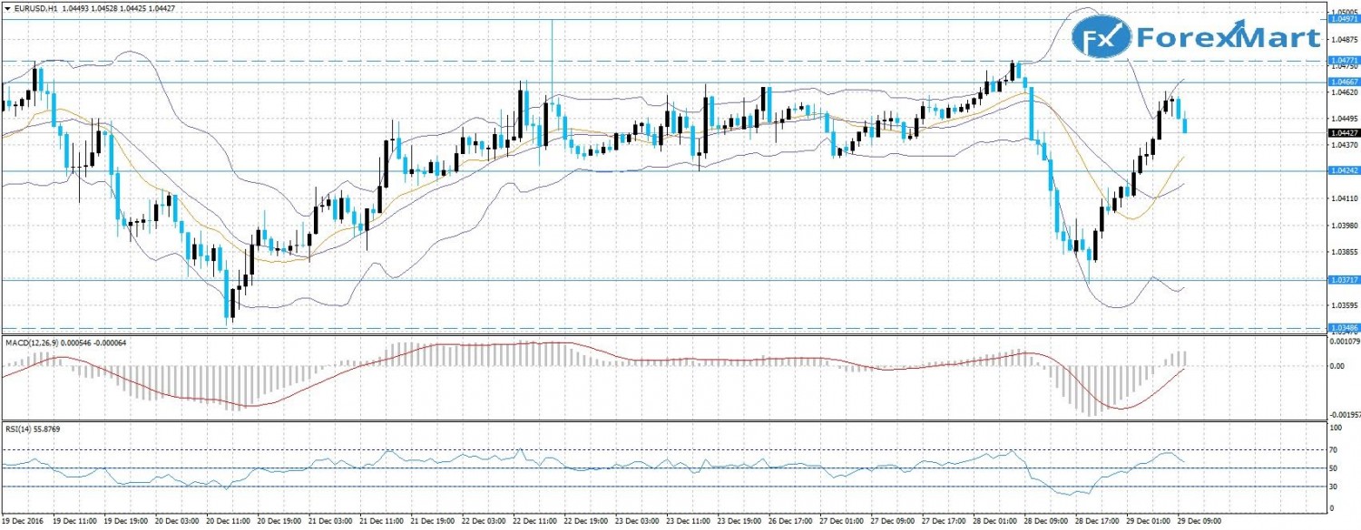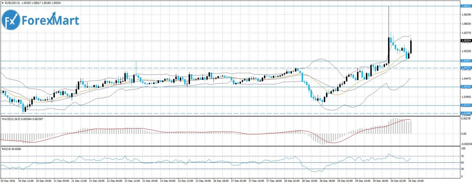 Вчерашний день пара завершила серьезным ростом: с уровня 1,0411 достигла сессионного максимума 1,0651. Такой большой рост можно объяснить работой роботов в связи с низкой активностью трейдеров, которые уже ушли на новогодние каникулы. Вероятнее всего пара закрое месяц и год в районе 1,0573, однако на низколиквидном рынке возможны любые ценовые колебания.