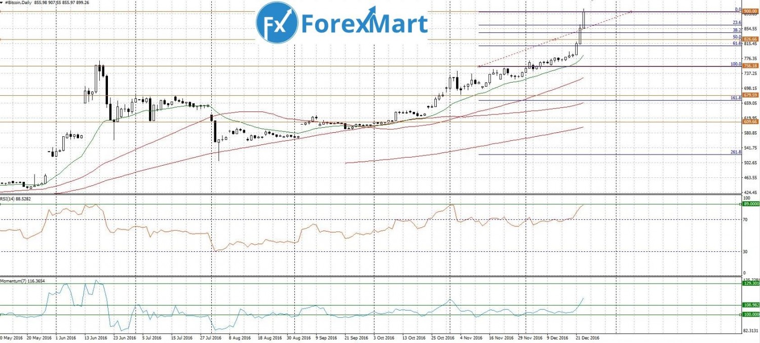Торговый инструмент биткоин/доллар США резко вырос до отметки $900, обновив зону локальных максимумов. Технически данный специфический торговый инструмент реагирует на области Фибоначчи, можно рассмотреть возможность покупок в случае коррекции от зоны 825. Как причину резкого подорожания биткоина называют нестабильность в геополитической ситуации в мире. Интересно поведение пары на фоне начала президентства Трампа, возможно использование торгового инструмента как “валюты-убежища” на фоне глобальных экономических потрясений. В ближайшее время ожидается дальнейшее увеличение интереса инвесторов к криптовалютам.