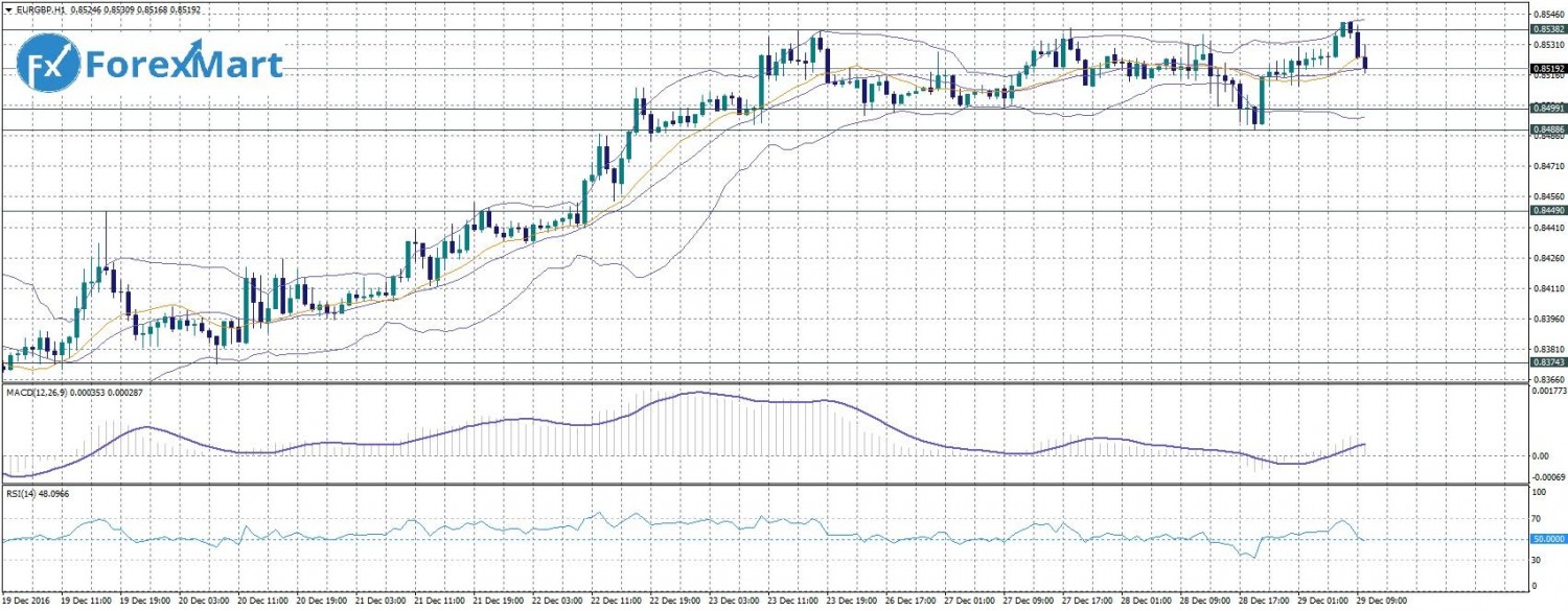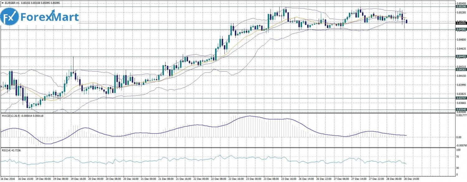 С 23 декабря пара находится в боковом тренде, не поднимаясь выше уровня сопротивления, и не спускаясь к поддержке. Вчерашний день закрыла ростом, достигнув отметки 0,8526. Сессионный максимум был зафиксирован возле сопротивления 1,8538, минимум возле отметки 0,8499. В краткосрочной перспективе пара продолжит расти. В рамках сегодняшнего прогноза ожидается продолжение восходящего тренда до уровня 0,88.