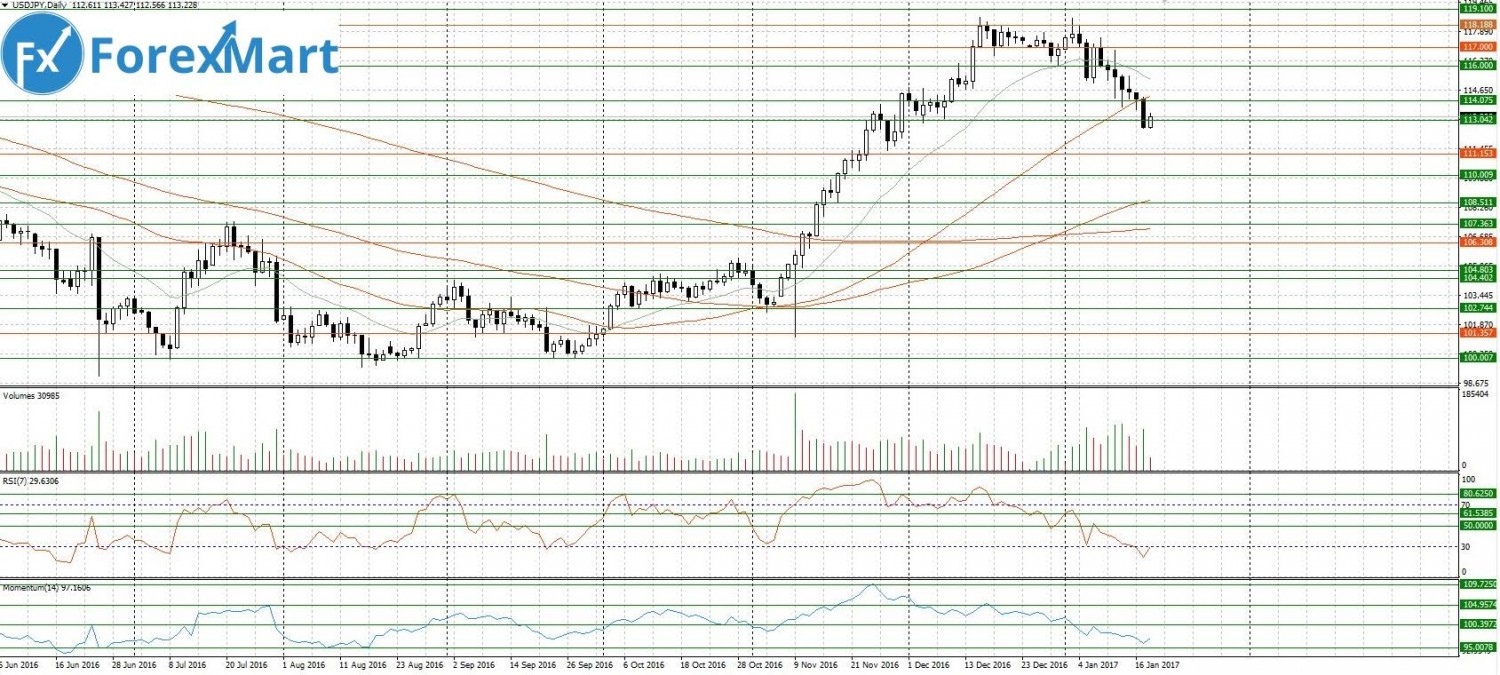 Валютная пара американский доллар/японская иена по итогам вчерашних торгов сформировала на дневном графике свечную модель “поглощение”. После ястребиных заявлений Джанет Йеллен пара вернулась к район простой скользящей с периодом 50, быки показали, что из еще рано сбрасывать со счетов и указали на возможность скорого возобновления восходящего тренда. Нижняя поддержка расположилась на 114.00, сегодня пара торгуется в узком диапазоне, рынок занял позицию временного равновесия в ожидании новых статистических данных из Америки, вечерний речи и вступления в должность президента США Дональда Трампа.