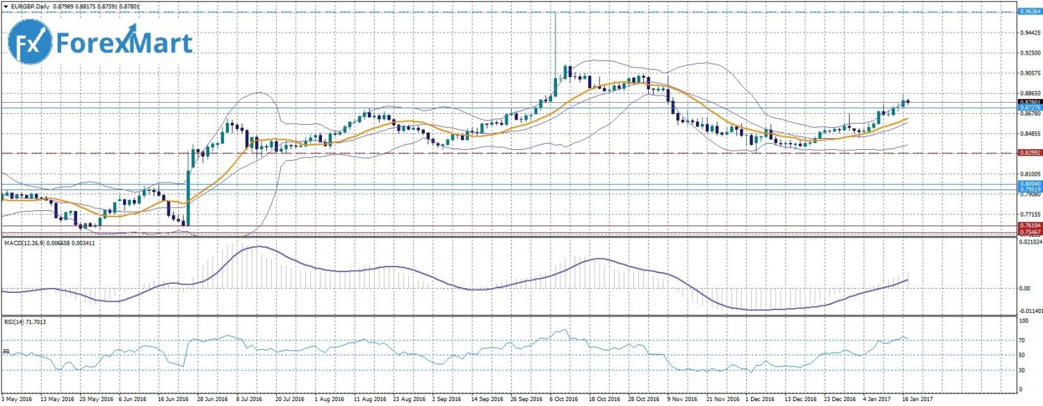 10 января восходящий тренд по паре был прерван, после чего пара вошла в боковой диапазон, который затянулся до 13 января. Пара предпринимала попытки вырваться за границы боковика, но попытки не увенчались успехом. 16 января пара открыла торговый день серьезным ростом, достигнув утром сессионного максимума возле уровня 0,8851, после чего вновь перешла к снижению. Индикаторы на дневном графике сигнализируют о продолжении восходящего тренда.