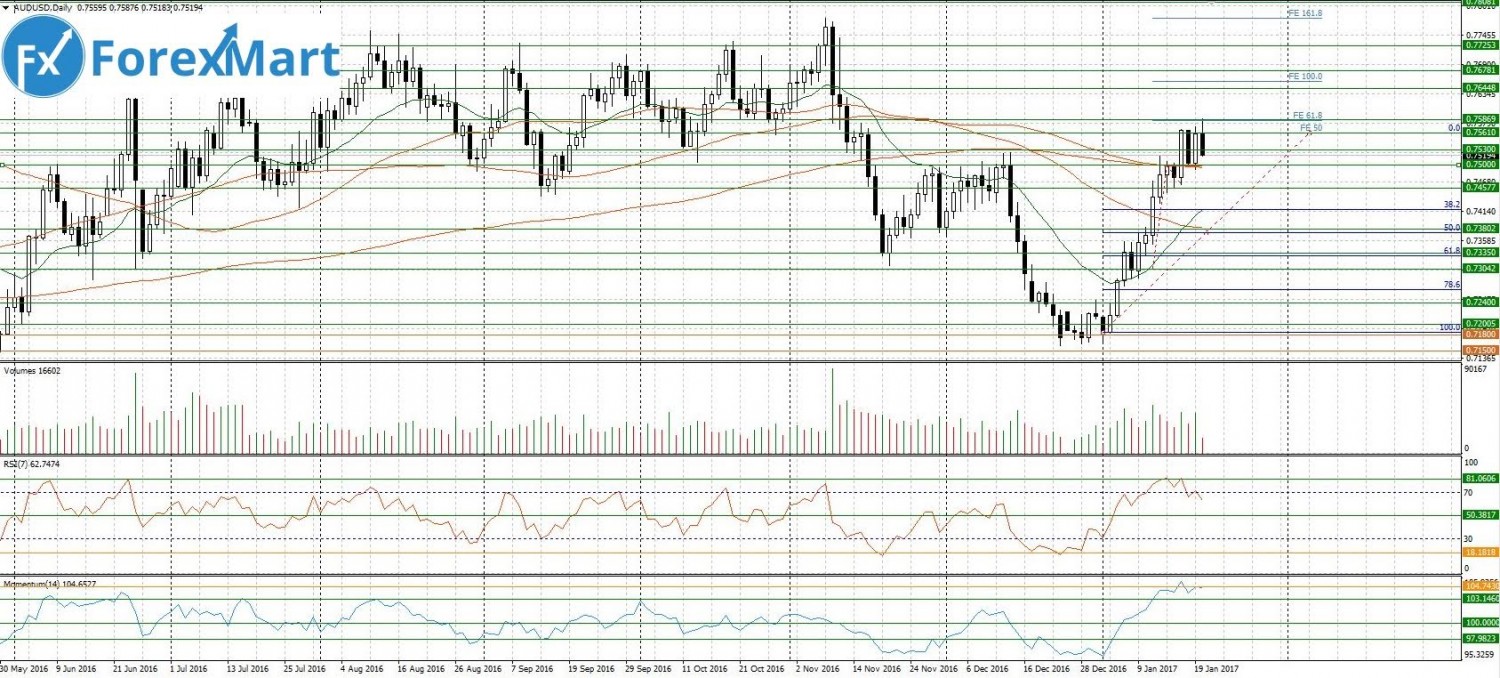 Валютная пара австралийский доллар/доллар США сформировала свечную модель “доджи” на уровне 0.7560 по итогам инаугурации Трампа. Предвыборная речь не вдохновила инвесторов, но и не дала повода с существенному падению американской валюты, теперь внимание приковано к первым действиям Дональда Трампа на посту президента. “Доджи” означает, что достигнуто временное согласие по поводу цены, в ближайшее время вероятно снижение к 0.7500 в рамках движения в боковом канале – пара ищет равновесия, серединной точки, с которой удобно начинать новый взлет или падение.